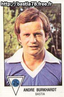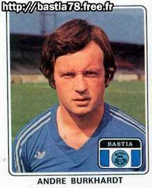 André BURKHARDT Né le 6.11.50 à Beufeld - 1m70 - 65 kg - A Bastia depuis 1973. Avant : Pierrots de Strasbourg, R.C. Strasbourg - 20 fois International Espoir 1 (comme Libero). - Actuellement arrière latéral (droit ou gauche). Le seul joueur de l'équipe actuelle en poste au S.E.C.B. depuis cinq saisons avec Papi et Orianducci. Technicien exceptionnel, ses qualités en la matière lui permettent de compenser largement une taille et une vitesse moyennes. André Burkhardt est certainement l'acquisition la plus payante du Club depuis 1973. Si l'on distribuait des Etoiles à l'intérieur d'une équipe, il serait certainement le leader de ce concours au S.E.C.B., car on compte sur les doigts d'une main les parties médiocres qu'il a pu fournir depuis qu'il est à Bastia. Il a été victime de deux graves blessures, une entorse du genou en 1974 et une fracture du péroné la présente saison. Dans les deux cas il a été indisponible pendant plusieurs semaines et en particulier il n'a pu participer entièrement jusqu'ici, à l'épopée de la Coupe de l'U.E.F.A., ayant été blessé à Sochaux le 22 octobre, trois jours après le match aller contre Newcastle. Professionnel d'une conscience exemplaire, joueur courageux, d'une correction impeccable sur le terrain comme dans la vie civile, André Burkhardt est un des piliers du S.E.C.B. Sa popularité est très grande dans le public où chacun aime et respecte celui qu'on a surnommé «Poupon» à cause de sa taille et de ses traits. Si l'on veut comprendre le véritable degré de la valeur technique d'André Burkhardt, il suffit de savoir qu'il a tenu très longtemps la porte de libero en sélection nationale des Espoirs, et qu'il le tient encore remarquablement à l'occasion, alors que sa taille constitue, pour le jeu de tête, un handicap certain. On se demande en tous cas pourquoi les sélectionneurs de l'équipe de France A n'ont pas regardé plus souvent du côté de Burkhardt, 20 fois Espoir, défenseur solide et adroit et surtout remarquable relanceur. |